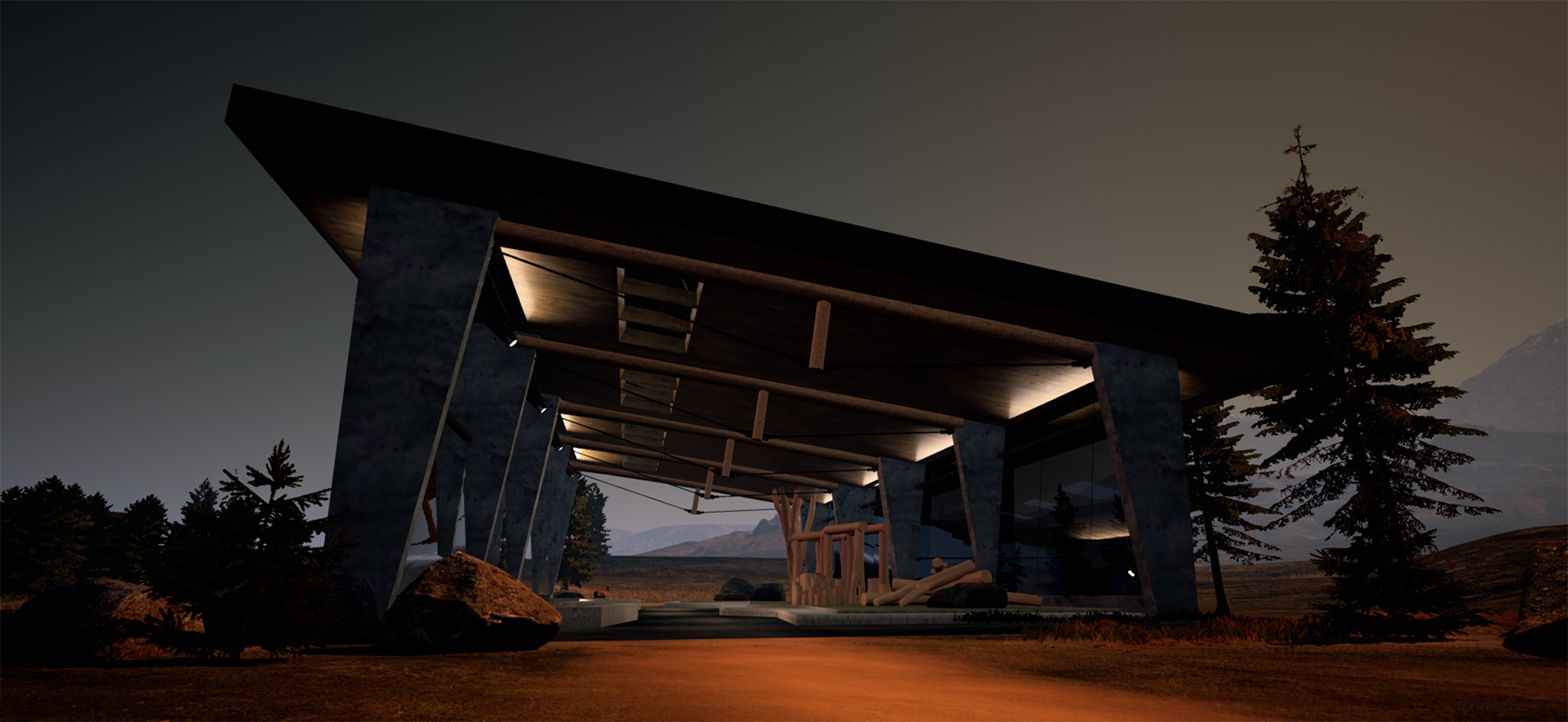 While learning Unreal Editor, I decided to use some FBX assets from WholeTrees in Madison, WI who offer design and engineering service that incorporates their unique raw timber construction. I quickly built an outdoor park shelter(Fusion 360) and incorporated their structures into it. Thanks to Brushify for all of the terrain assets.
