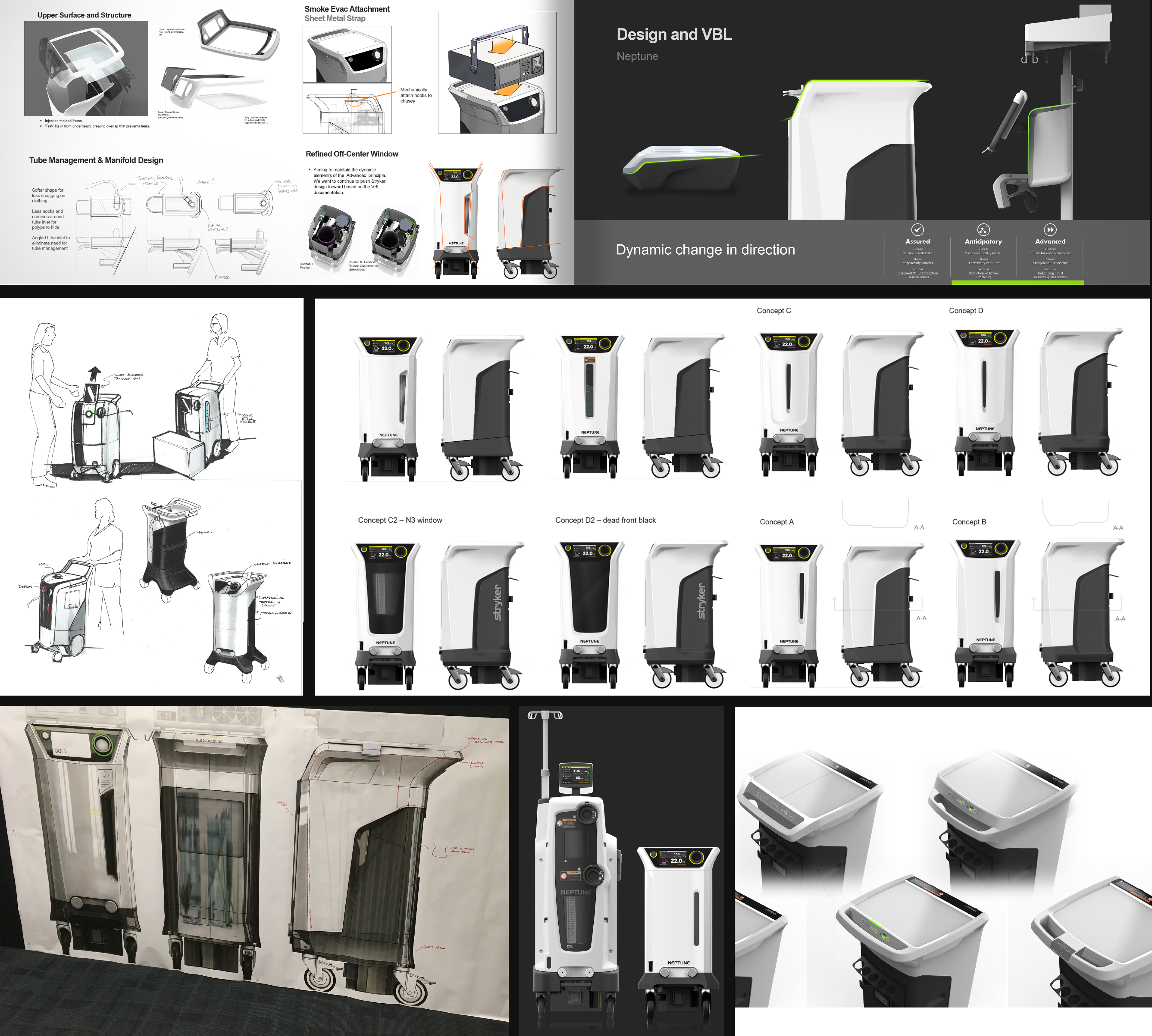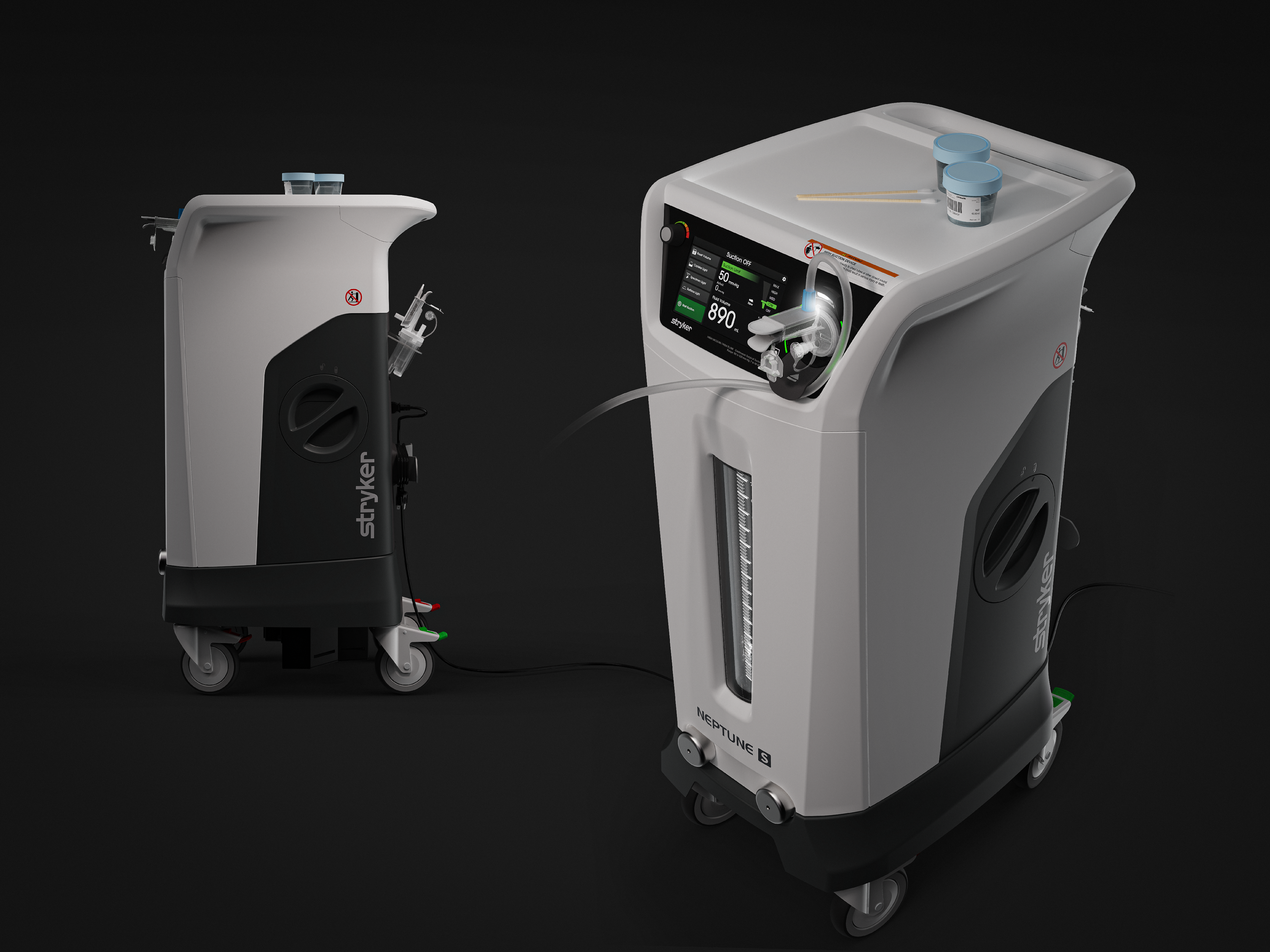 The Neptune S is a surgical waste management system designed to keep liquids safely contained without the added waste of disposable plastic canisters. I served as project manager and designer, partnering with Rachel Wallace, who led the initial industrial design concept. Working closely with the Stryker team, Delve developed a new Neptune system specifically tailored for the needs of ambulatory and GI clinics.